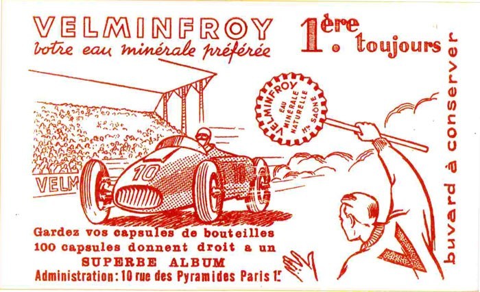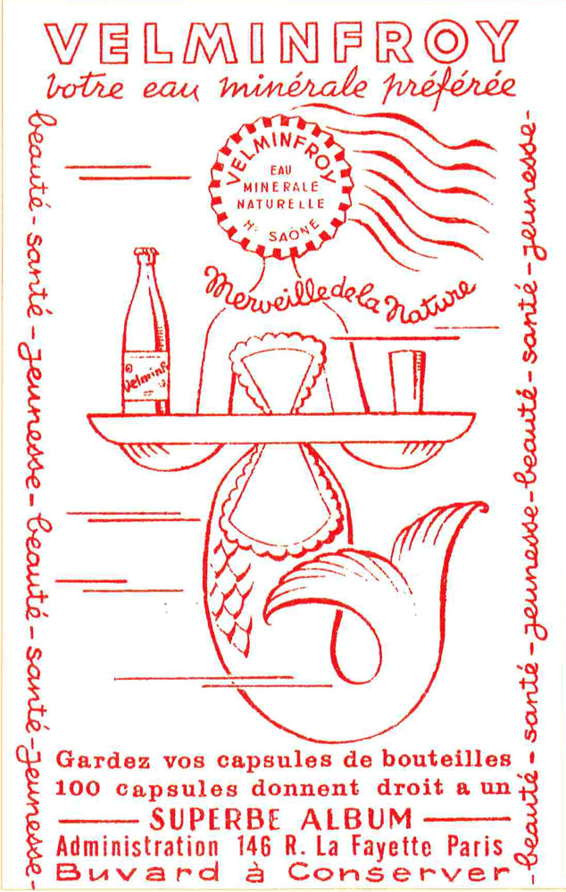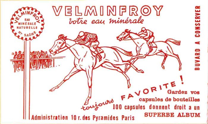 Cartons, tracts et affiches publicitaires pour promouvoir l’eau minérale de Velleminfroy (eau plate et eau gazéifiée)