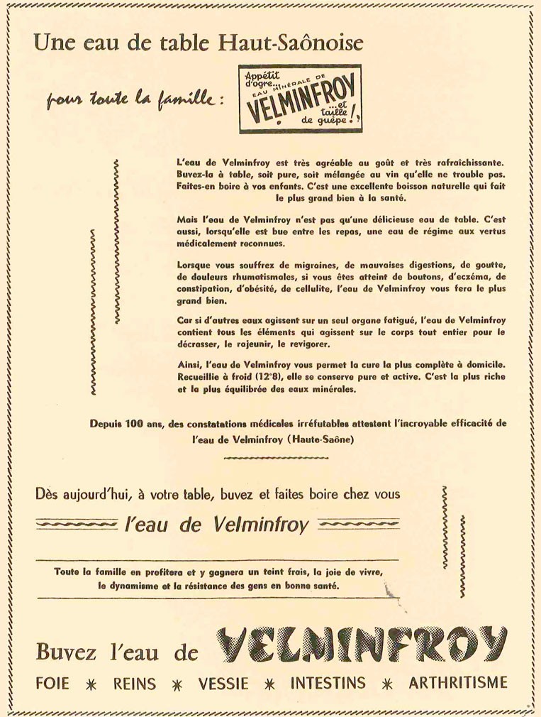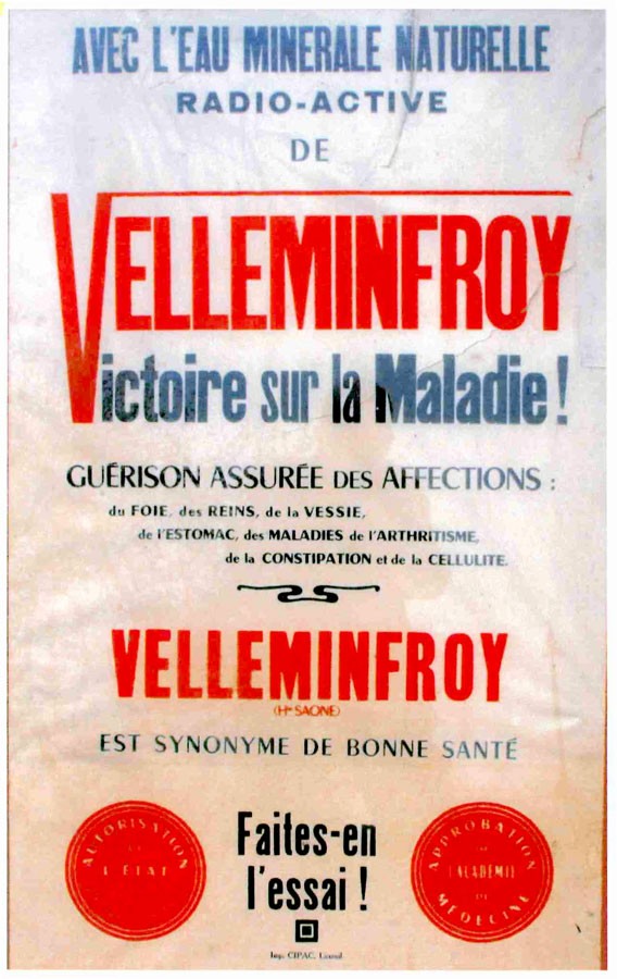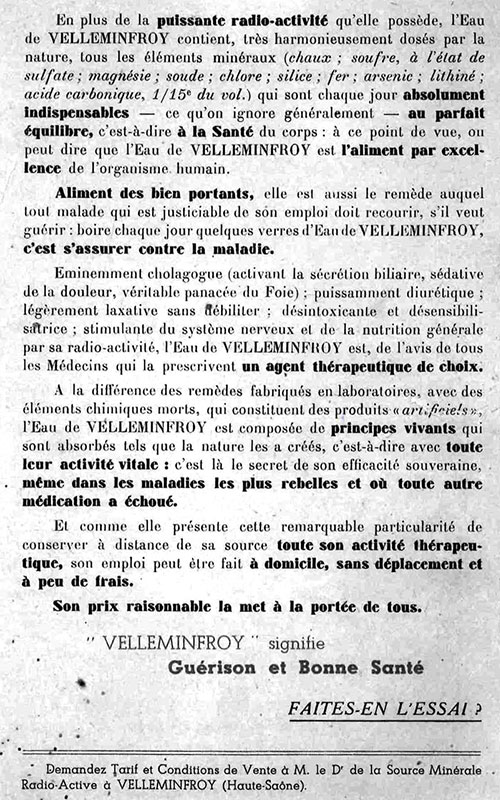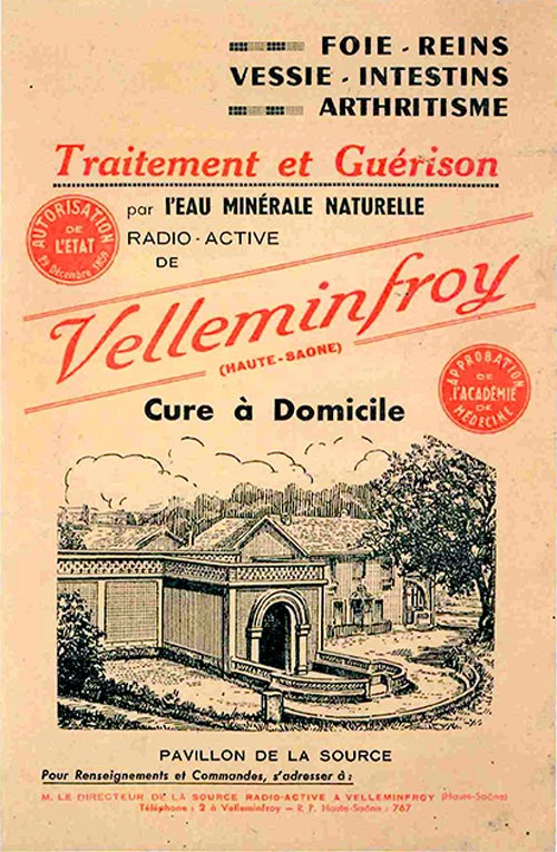 A cette époque, les publicités font la promotion d’une « cure à domicile qui guérit et conserve la santé » idéale pour le foie, les reins, la vessie, les intestins et l’arthritisme. Dans les tracts, on peut même y lire : « Elle triomphe des cas les plus rebelles, et où toute autre médication a échoué ». L’eau minérale de Velleminfroy est vendue dans des commerces locaux à raison d’une centaine de litres par jour. Faute de capitaux suffisants la distribution de l’eau cesse en 1937.